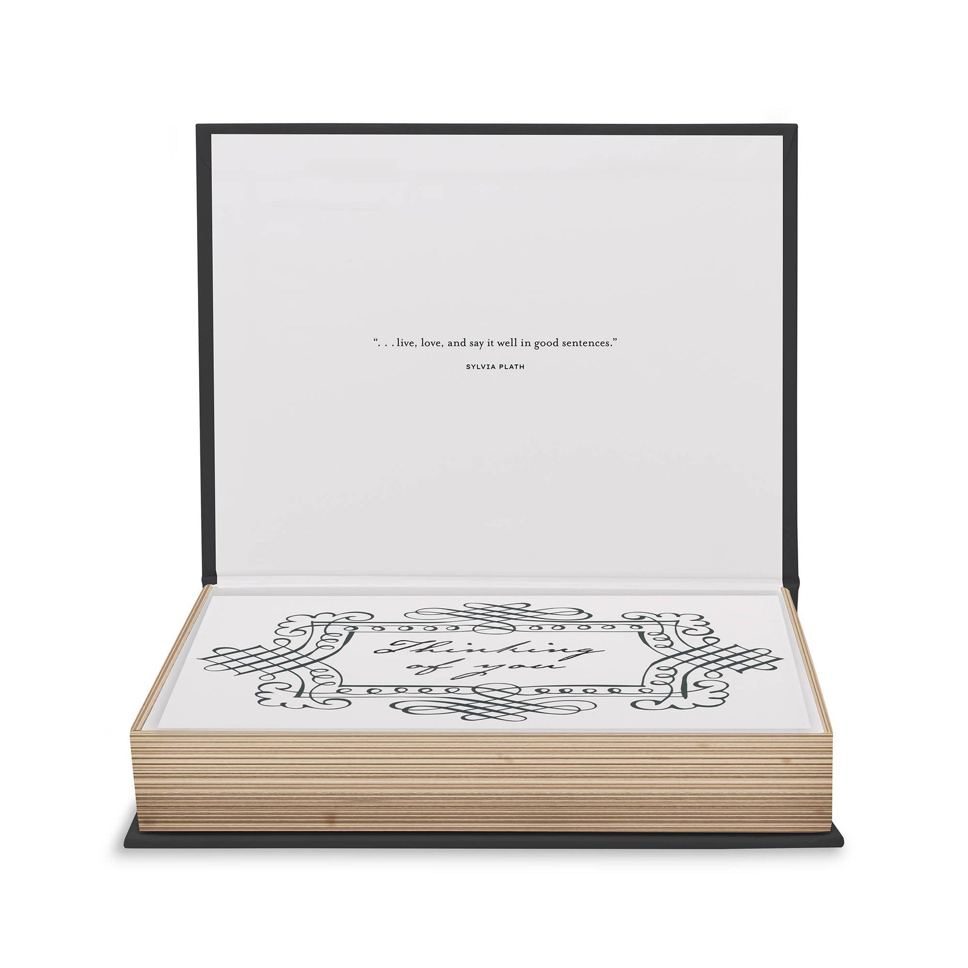 Celebrate the Modern Art of correspondence with this set of 10 notecards with gold foil lined envelopes for all occasions. Each card features a curated Amelin Archive pattern with a blank back to allow for customized messages. The eclectic collection is encased in a stunning paper wrapped box designed to look like a book.
